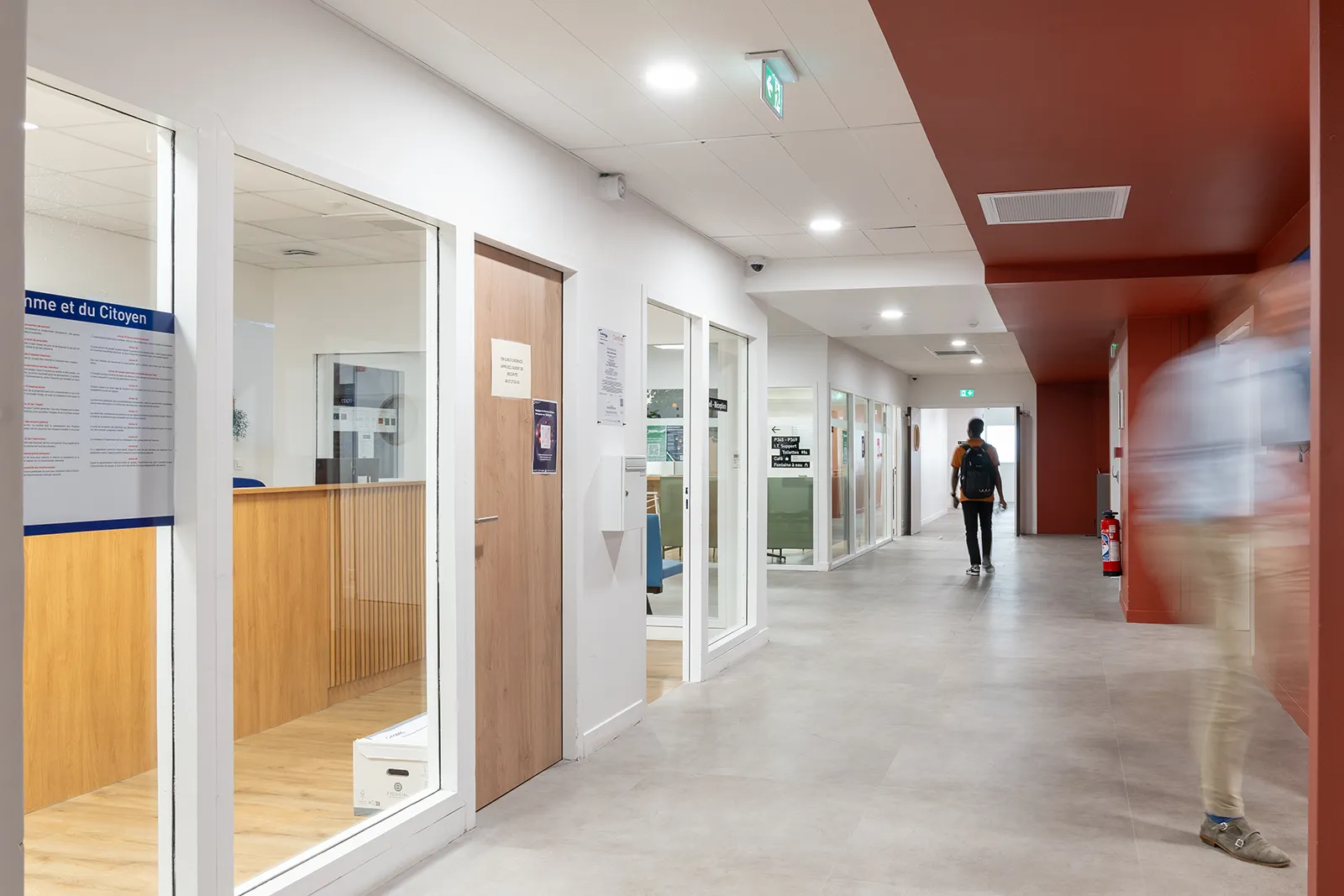 Le projet concerne l’adaptation et la mise en conformité d’un ensemble immobilier existant afin d’accueillir un campus d’enseignement supérieur du groupe OMNES, au sein de l’immeuble Pollux, implanté sur dalle piétonne dans le 15ᵉ arrondissement de Paris. Le bâtiment, construit au début des années 1970, s’inscrit dans un ensemble urbain complexe composé d’immeubles de grande hauteur, de jardins suspendus et d’équipements publics.